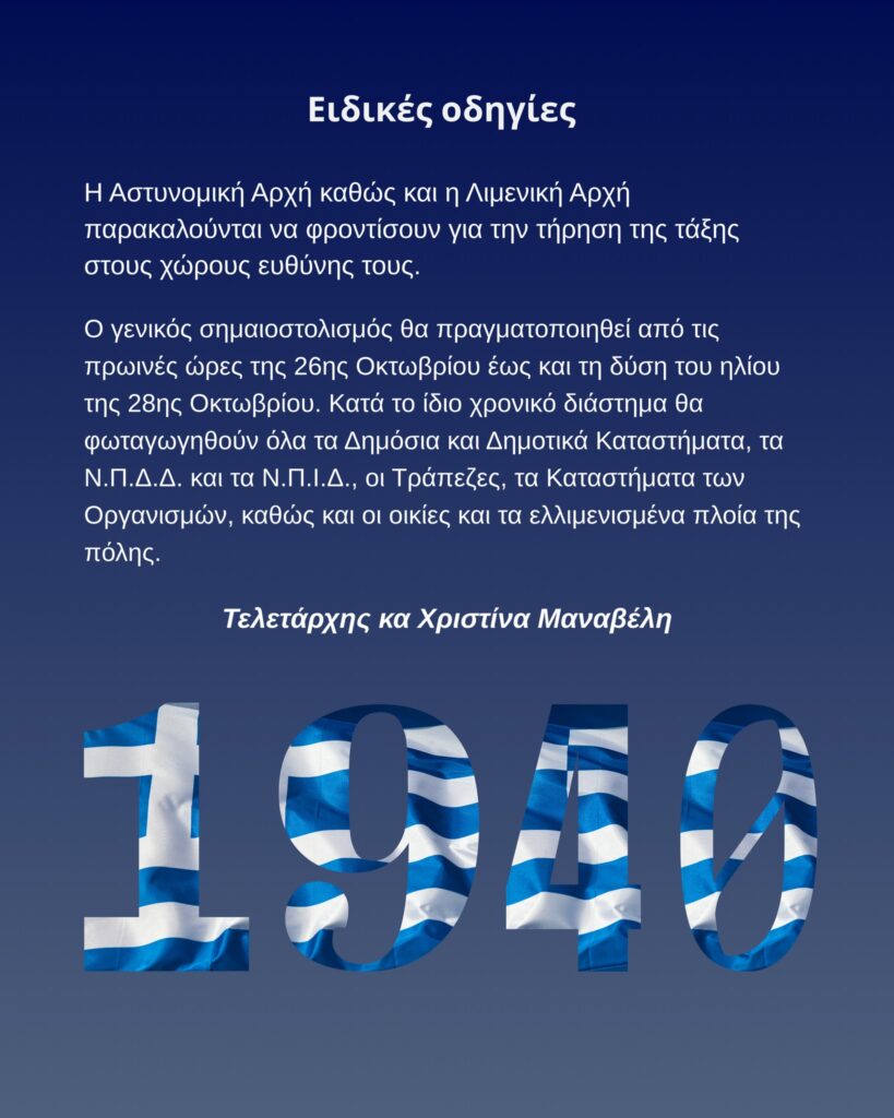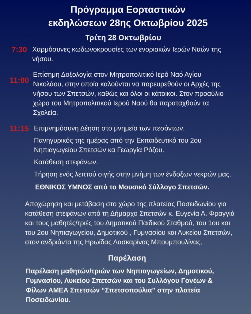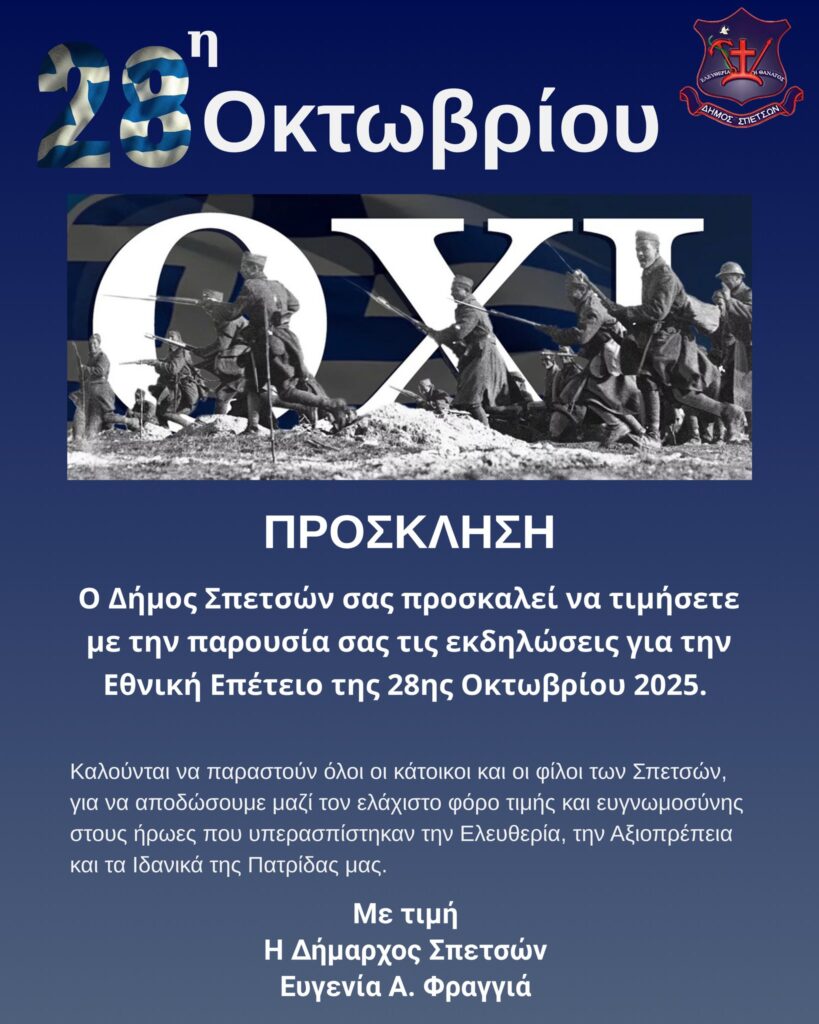 Ο Δήμος Σπετσών σας προσκαλεί να τιμήσετε με την παρουσία σας τις εκδηλώσεις για την Εθνική Επέτειο της 28ης Οκτωβρίου 1940.