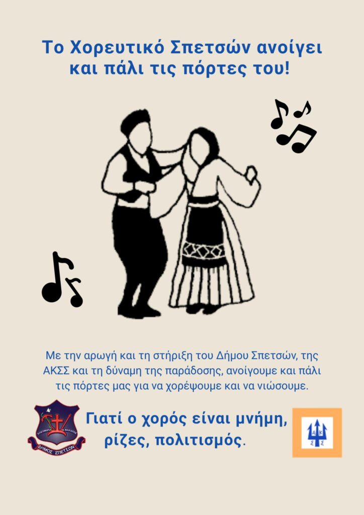 Με την αρωγή και τη στήριξη του Δήμου Σπετσών, της ΑΚΣΣ και τη δύναμη της παράδοσης, ανοίγουμε και πάλι τις πόρτες μας για να χορέψουμε και να νιώσουμε.